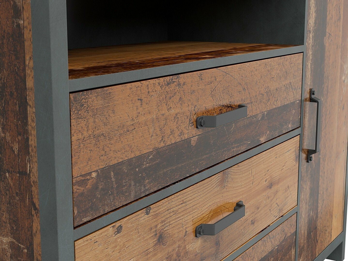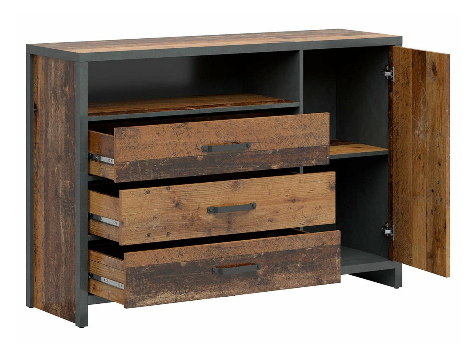 Az industrial stílusú belső terek stílusa rendkívül népszerű, különösen az olyan terekben, mint a loft. A városi élet ihlette stílus segít egyedi belső teret létrehozni. Sötét színek, nyers beton falak, fémes díszítések, barna és "Matera" szürke dominálnak itt. Ha indusztriális hangulatot szeretne teremteni otthon, vagy akár egy fiatal férfi szobájában, akkor ez a kollekció megérdemli a figyelmet. A kollekció bútorai a legválogatósabb fiatalok igényeit is kielégítik. A bútorok kialakítása segít egy stílusos helyiség kialakításában, ahol mind az időtöltés, mind a tanulás örömet okoz. A bútorok szélei a fogantyúkhoz passzoló sötétszürke színnel vannak kezelve. A kollekcióból nem hiányoznak a változatos formák és elrendezések, rengeteg polc és szekrény található. Így könnyebb lesz rendet tartani a szobában.