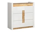Ez a bútorkollekció egyedülálló abban, hogy a bútormodellek széles választékát kínálja különféle otthoni terekhez. Hozzon létre szilárd belső teret a nappaliban és a hálószobában egyaránt. Mi van, ha a bútor a folyosón is elfér? Vagy az irodában? Mindez lehetséges ezzel a kollekcióval. A világos színpaletta kicsiben és nagyban is jól mutat. A bútorok homlokzatán a fényes fehér szín dominál, melyet a fa színű részletek tökéletesen kiegészítenek. A fa színe és mintái szépen feltárulnak a bútorasztalokon, meghitt hangulatot kölcsönözve. A fogantyús megoldás is megragadja a tekintetet, ami nemcsak fogantyúként, hanem dekor részletként is megállja a helyét. A dolgok tárolására minden bizonnyal lesz elég hely, a bútorokban rengeteg fiók és polc található. További varázst a beépített energiatakarékos LED világítás biztosítja. Ezzel a megoldással kellemes fényt élvezhet, amely kiemeli a fa színű betéteket. A csendes záródási mechanizmus megvédi az ajtókat és a fiókokat a gyors becsukódástól.