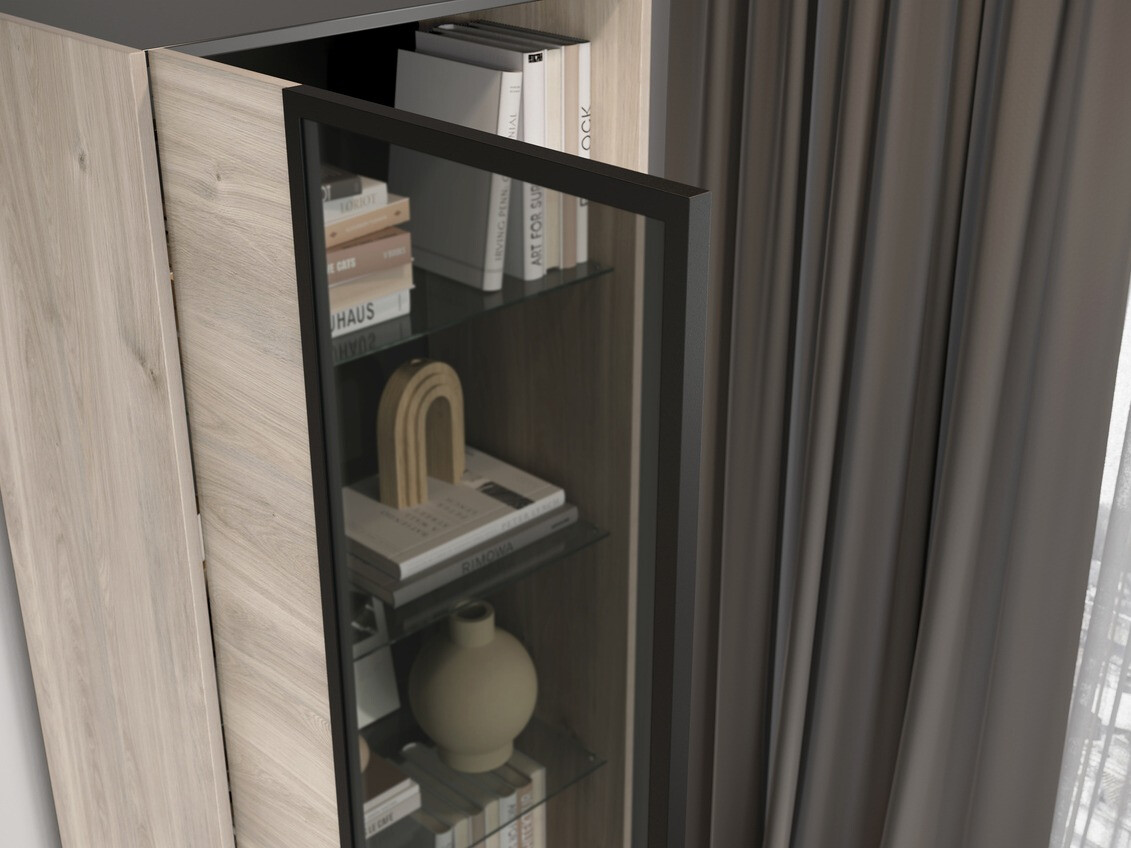 Esztétikus és minimalista design bútorkollekció, Németországban készült. Ezek a bútorok nem csak kifogástalan kialakításukról, hanem funkcionalitásukról is ismertek. A kollekció tartalmaz egy integrált "Push to open" nyitó mechanizmust, amely biztosítja az ajtók és fiókok zökkenőmentes nyitását, míg a lágyan záródó mechanizmus segít megelőzni a hirtelen és zajos bezárásokat. Ez a bútorkollekció a tartósságot is előtérbe helyezi, védett élei és felületei ellenállnak a kisebb karcolásoknak. Ezek az elemek hozzájárulnak a bútor megjelenésének megőrzéséhez és otthoni élettartamának meghosszabbításához. A kollekció elegáns fém lábakkal rendelkezik, amelyek nemcsak a bútorok stabilitását biztosítják, hanem modern megjelenést is adnak. A világos tölgy és a fekete színek kombinációja hangulatos és letisztult légkört teremt, amely bármilyen belső stílust kiegészít. Ezek a bútorok robotporszívóhoz is alkalmasak, így az otthoni takarítás gyerekjáték. Ez a kollekció tökéletesen megtestesíti a stílus és a funkcionalitás egyensúlyát otthonában.