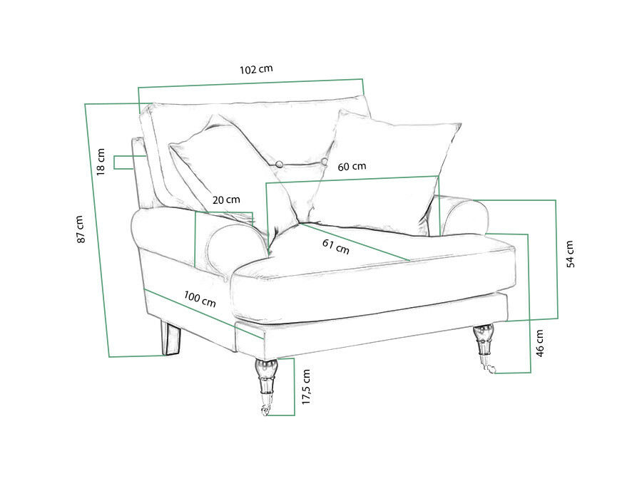 A bútor ülőfelülete cikk-cakk rugókból készült, melyek ívelt formájuknak köszönhetően rendkívül rugalmasak és tartósak. Nekik köszönhetően a kárpitozott bútorok hosszú ideig megőrzik ugyanazt az üléskomfortot. Fa lábak arany vagy ezüst görgőkkel kiegészítik az elegáns bútordarabot. A bútor hátulja ugyanazzal a szövettel van bevonva, mint a fő része, így ebben a kollekcióban a bútorok a szoba közepén is elhelyezhetők.