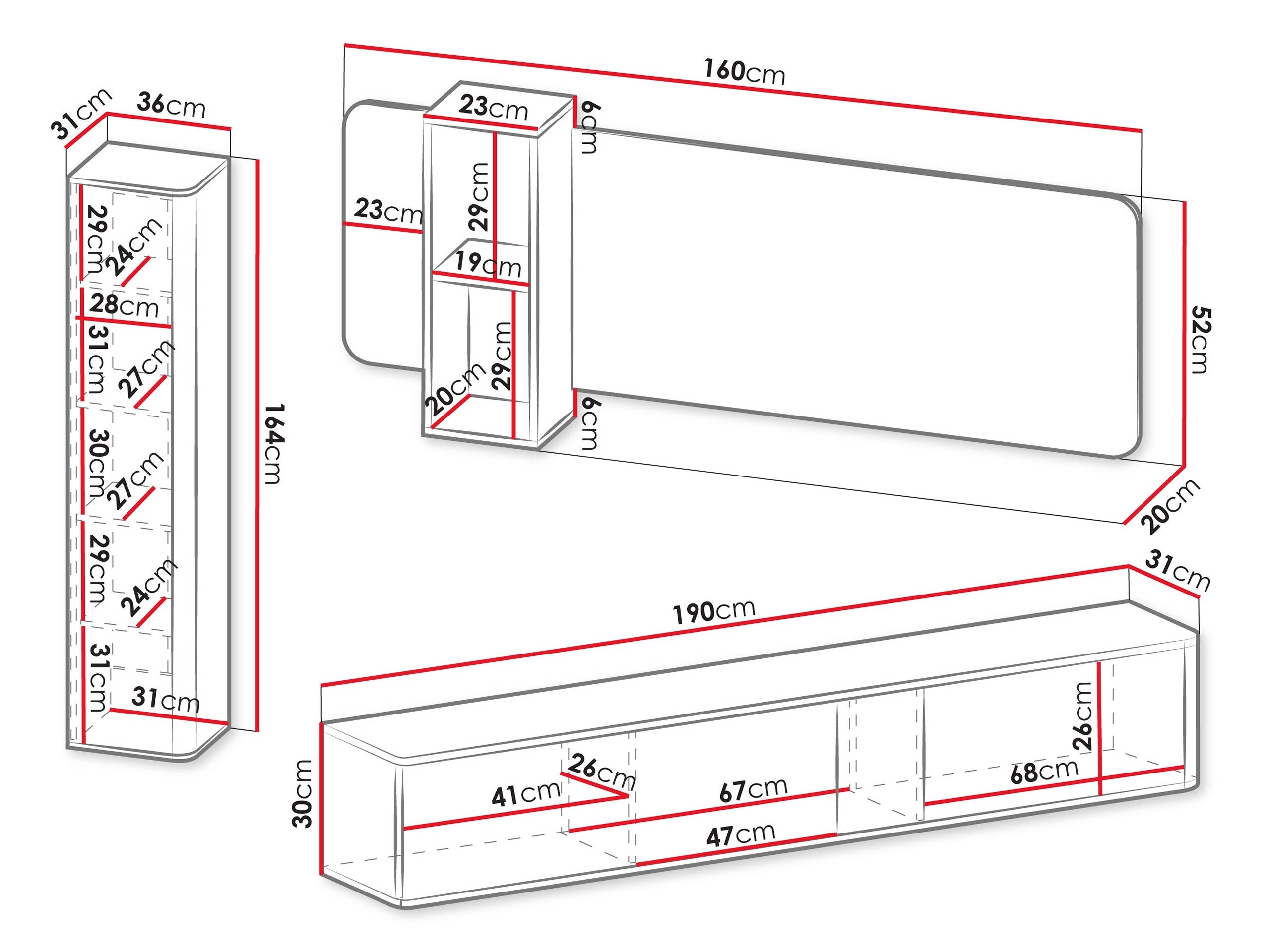 164 x 36 x 31; 52 x 160 x 20 cm