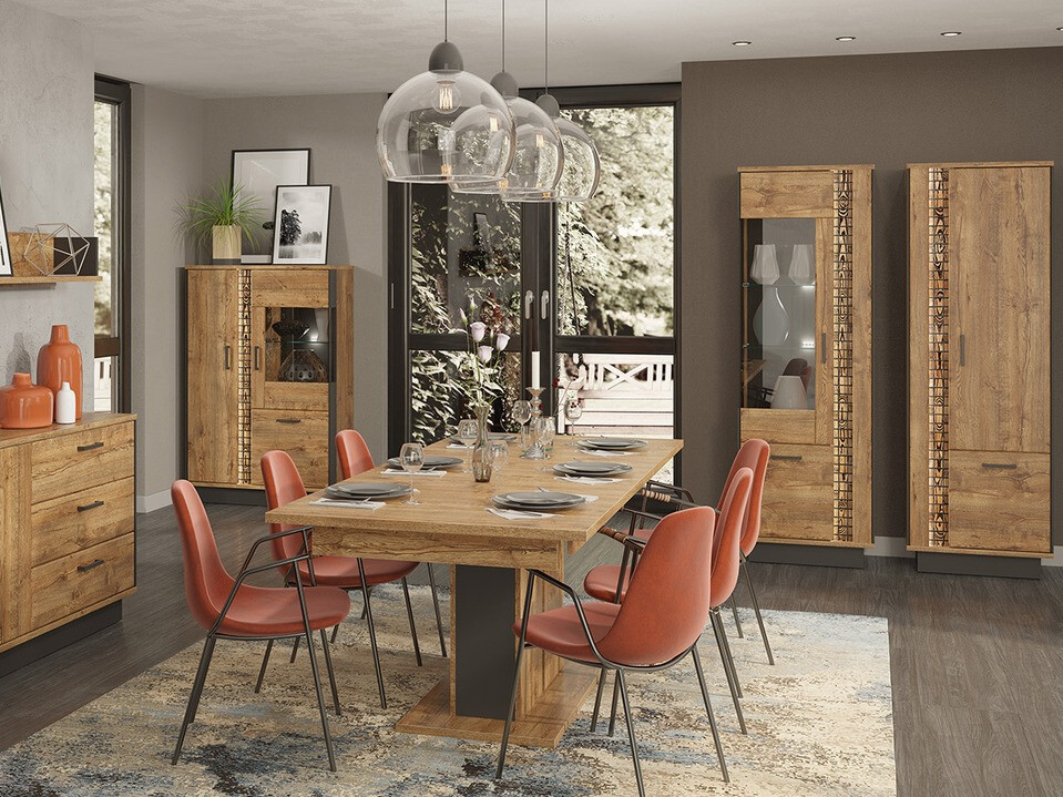 A kollekcióban található bútorokkal otthona nem marad észrevétlen. A kollekció olyan bútorok széles választékát kínálja, amelyek leginkább nappaliba vagy hálószobába illeszkednek. Az "April" tölgy és fekete színkombinációnak köszönhetően a bútorok különösen alkalmas az indusztriál enteriőrbe.A fa betét, autentikus akcentusa ennek a kollekciónak egyediséget ad, a fekete műanyag fogantyúk pedig tökéletesen belesimulnak a dizájnba A bútorhomlokzatok forgácslapból készülnek,amit speciális ABS szalag, amely megvédi a bútor széleit a sérülésektől.A fiókok és ajtók minden további zaj nélkül záródnak, mert ennek a kollekciónak a bútorai csendes zárással rendelkeznek. A bútorvitrinek hőkezelt edzett üveget használnak. Az ilyen típusú üveg sokkal biztonságosabb és tartósabb, mint a közönséges üveg. Ezen kívül a vitrinekben energiatakarékosLED világítás is bekapcsolható romantikus estékre. Egy nagyon praktikus bútor ebből a kollekcióból egy dohányzóasztal transzformátor. Ez az asztaltípus lehetővé teszi, hogy élvezze a hagyományos dohányzóasztalt, amely nem foglal sok helyet, és ha szükséges, átalakíthatja étkezőasztallá, amelyen az egész család vagy a vendégek elférnek. A kollekció kétféle gardróbot is kínál - egy keskenyebbet csuklós ajtókkal és egy nagyobbat tolóajtós és tükörrel. Párosítsa a kollekció bútorait a falak világos árnyalataival, hogy karaktert adjon a helyiségnek. Ha sötét színű falakkal és bútorokkal kombinálja, igazi ipari stílusú belső teret alakíthat ki.