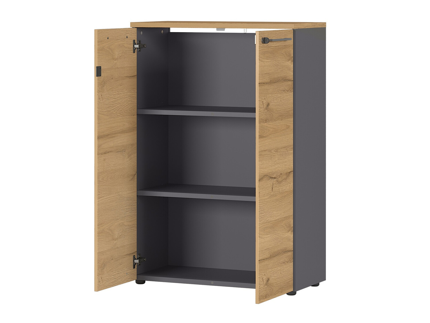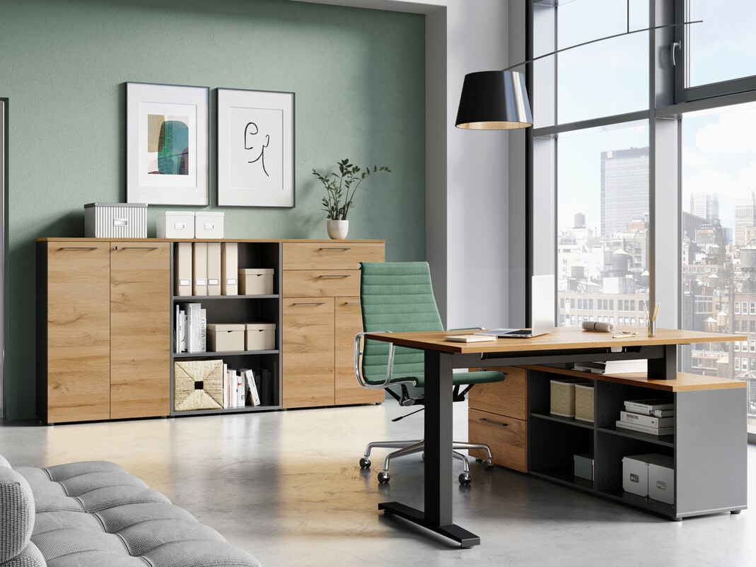 A modern designú bútorkollekció minden minimalista dizájn rajongót elragad majd. Ebben a bútorkollekcióban több szín közül választhat. A világosszürke bútorok felvillanyozzák majd a világosabb színeket kedvelőket, a "Grandson" tölgy bútorok grafit színnel kiegészítve a természetesség szerelmeseit inspirálja majd. Ezt a bútorkollekciót fém fogantyúk egészítik ki, amelyek könnyedséget kölcsönöznek a belső térnek. A bútor könnyen karbantartható, mivel színtelen anyaggal van bevonva, amely megóvja az apró karcolásoktól és lehetővé teszi a felgyülemlett szennyeződések könnyű tisztítását. Ez a kollekció műanyaggal védett élekkel is rendelkezik, amelyek ütésálló anyagokból készültek. A fiókok és ajtók csendes záródású mechanizmussal rendelkeznek, aminek különlegessége, hogy megakadályozza a gyors záródást. A funkcionalitás és a kényelem a német gyártmányú kollekció szerves jellemzői. A szekrények lehetővé teszik a dolgok legkényelmesebb tárolási módját, a zárható fiók gondoskodik a magánéletről, az állítható magasságú asztal pedig kényelmes munkahelyet teremt. Ez a bútorkollekció segít Önnek modern munkakörnyezet kialakításában.