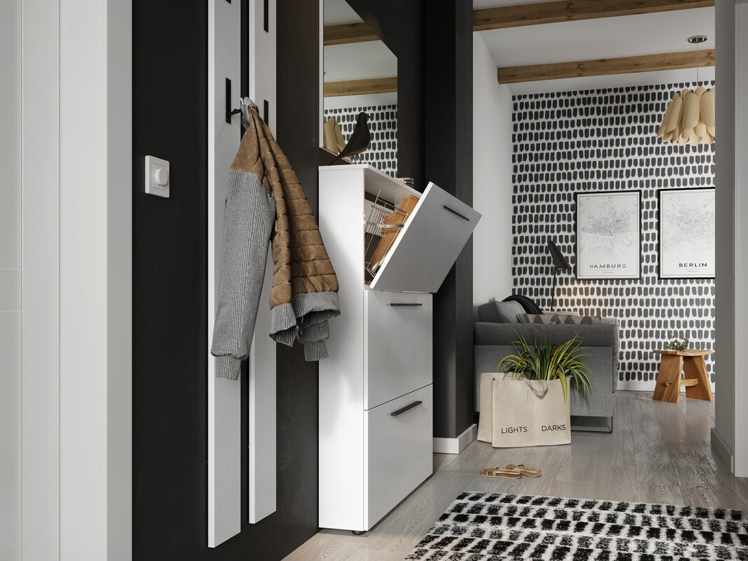 A modern dizájnú előszoba garnitúrák kollekciója minden modernitás szerelmesét le fogja nyűgözni. A kollekciót hosszú fekete fém fogantyúk egészítik ki, amelyek tökéletesen illeszkednek a bútorok kialakításába. A bútor könnyen karbantartható, mivel színtelen anyaggal van bevonva, amely megóvja az apró karcolásoktól, és könnyen tisztítható a felgyülemlett szennyeződésektől. A bútorkollekció széleit védőfólia borítja, mely erős műanyagból készült és megóvja a bútort az apróbb sérülésektől. A fiókok és ajtók csendes záródású mechanizmussal rendelkeznek, aminek különlegessége, hogy megvédi őket a gyors becsukódástól. A keskeny szekrények tökéletesen illeszkednek otthona kialakításába, a bennük lévő fém cipőtartók pedig kényelmes tárolást biztosítanak. A funkcionalitás és a kényelem a Németországban gyártott kollekció szerves részét képezik. Teremtsen modern környezetet ezzel a bútorkollekcióval.