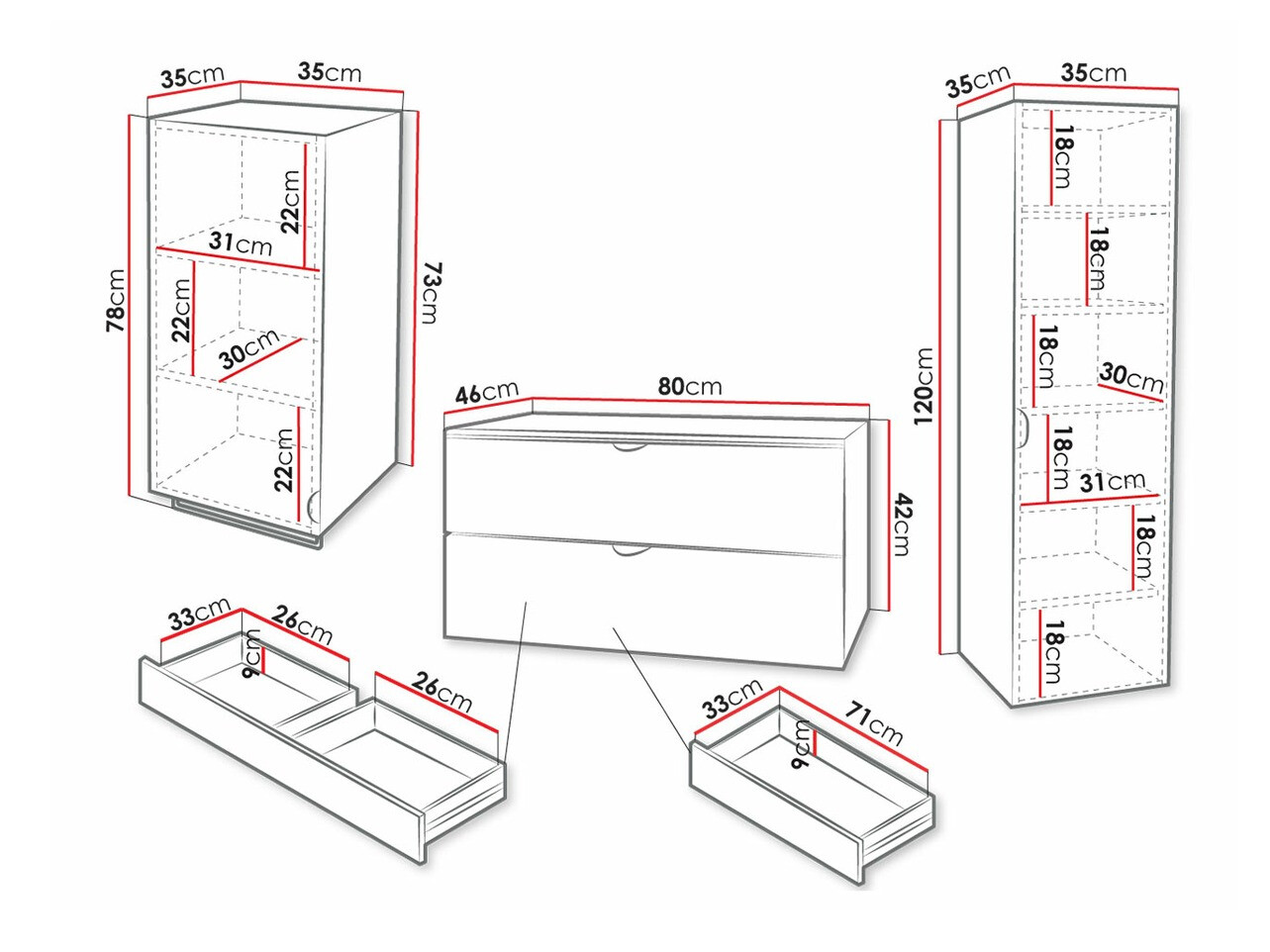 120 x 35 x 35; 78 x 35 x 35 cm