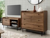 Finomság, elegancia és retró hatás – így jellemezhető röviden ez a kollekció. Az elegáns forma, valamint a sötét tölgy és a fekete szín fényűző kombinációja adja a bútor egyediségét. A kollekció minden olyan bútort tartalmaz, amely egy szervezett működéshez szükséges nappali. A bútorok laminált forgácslapból készülnek, melynek széleit speciális ABS szalag védi. A kiváló minőségű ABS éleknek köszönhetően a bútor ütésállóbb. Az ajtók és fiókok csendes záródású mechanizmussal rendelkeznek, melynek köszönhetően a fiókok és ajtók könnyen, zaj nélkül záródnak. A bútorok elejét kis fekete fém fogantyúk díszítik, amelyek illeszkednek az elegáns kollekció bútoraihoz. A kecses fém lábak eredetiséget és stílust adnak a szabálytalan alakú bútorokhoz. A kollekció bútorai nyitott és zárt tárolórésszel is rendelkeznek, így alkalmasak személyes tárgyak praktikus bemutatására. A vitrinekben lévő üvegezett rész edzett üvegből készült. Ellenállása 5-6-szor nagyobb, mint a hagyományos, termikusan kezeletlen üvegnél. Az ilyen típusú bútorok ideálisak dekorációk, edények vagy fényképek megjelenítésére. Ezen kívül ez a bútor LED világítással is kiemelhető, mely külön rendelhető. Ezen kívül a vitrinek univerzálisak, így összeszerelésükkor lehetőség nyílik az ajtók nyitási irányának eldöntésére üveggel. Alkosson egyedi nappalit a kollekció egyedi bútoraiból, vagy válasszon előre elkészített bútorkészletek közül. A kollekció bútoraival a kívánt tér a kényelem és az elegancia oázisává válik.