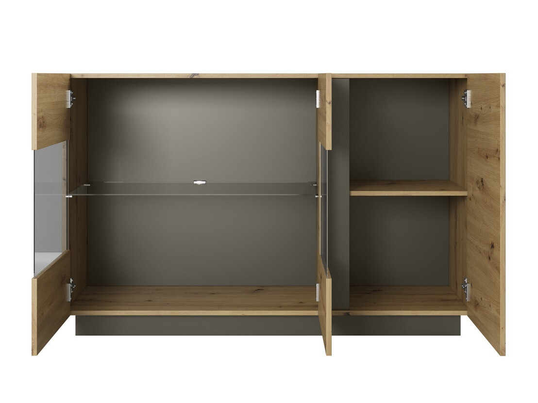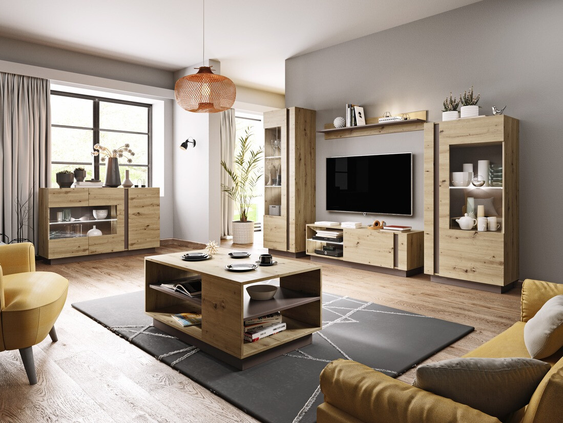 Ez a modern stílusú kollekció kifogástalan eleganciát kölcsönöz a nappalinak. A fényes fehér szín harmonikusan keveredik a "Grandson" tölgy kifinomult árnyalatával, amely kivételes varázst kölcsönöz otthonának. Ezt a bútort különös figyelemmel tervezték a részletekig, hogy otthona lenyűgöző legyen. A bútorok nemcsak esztétikusak, hanem praktikusak is. A beépített csendes záródási mechanizmus gondoskodik arról, hogy az ajtók és a fiókok minden további zaj nélkül csukódjanak. Ráadásul a kinyitásuk rendkívül egyszerű és kényelmes lesz, hiszen a fiókokba és az ajtókba be van építve a "Push to open" nyitómechanizmus. A kollekció edzett üveget használ, amely ellenállóbb és biztonságosabb, mint a hagyományos üveg. A bútorok szélei védettek, így nyugodt lehet a kopásuk miatt. Ha szeretné még egyedibbé tenni a nappali belsejét, választhat még LED világítást. Ez a kollekció tökéletes azok számára, akik otthonuk belsejében finom szépséget és kényelmet keresnek. Egyedi varázst kölcsönöz otthonának, és segít a kényelmes és elegáns környezet kialakításában, ahol úgy érzi majd magát, mint álmai otthonában.