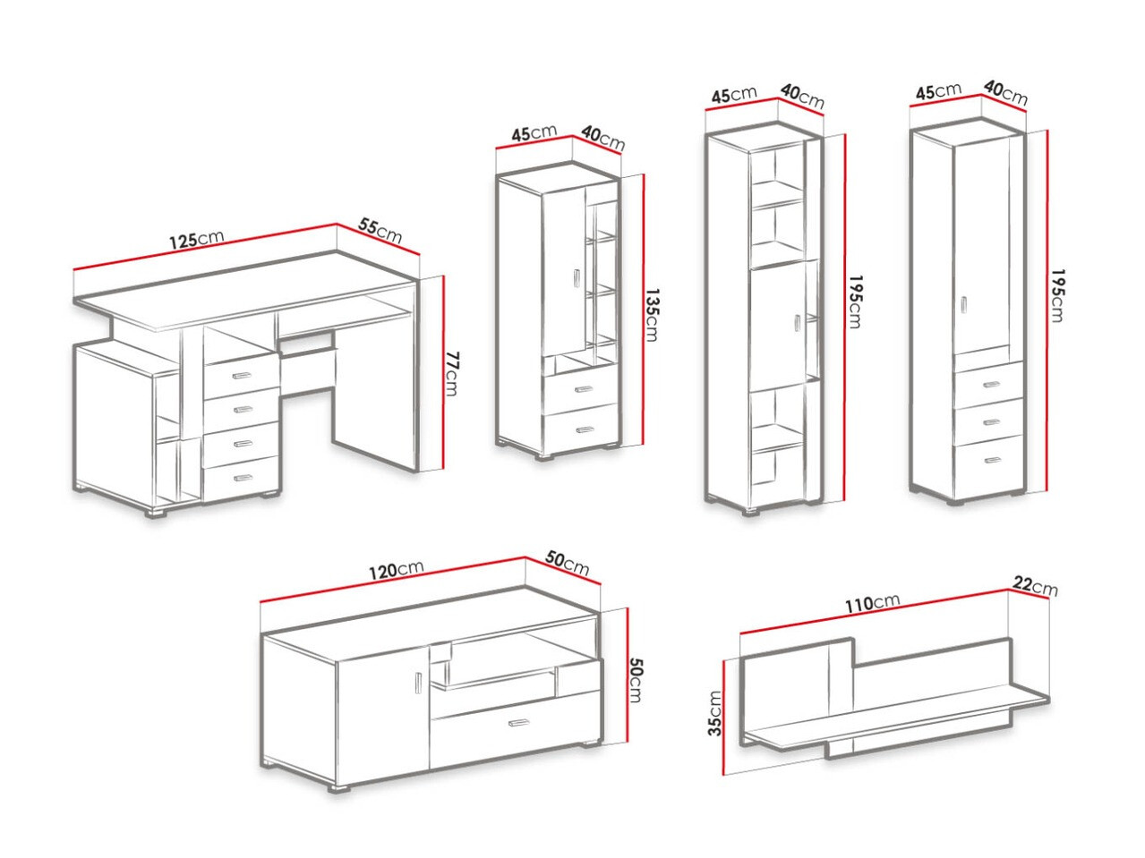 195 x 45 x 40; 135 x 45 x 40 cm