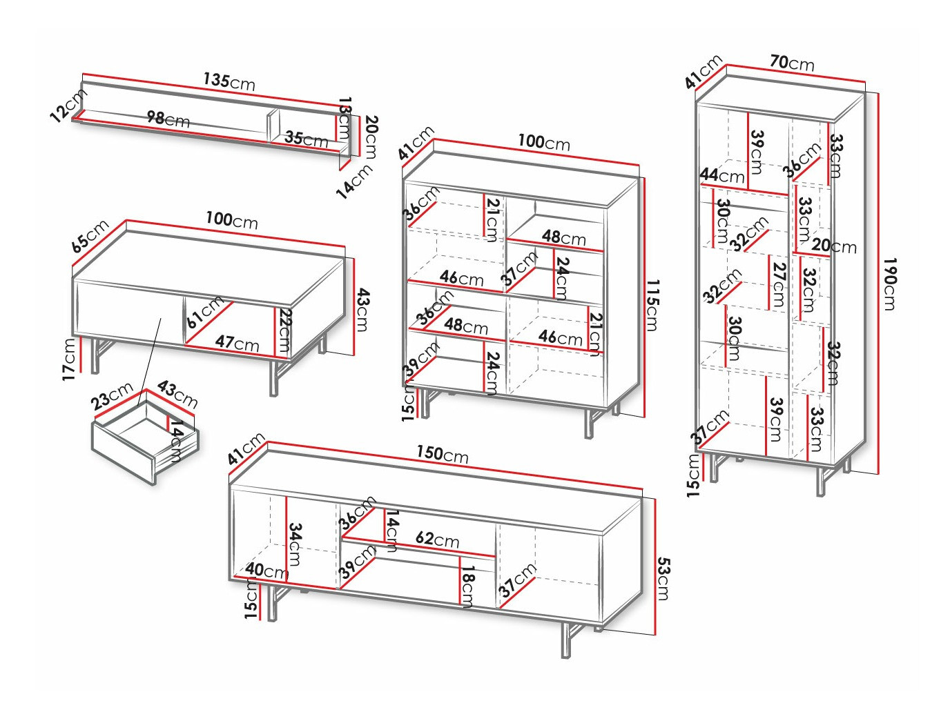 190 x 70 x 41; 140 x 90 x 41 cm