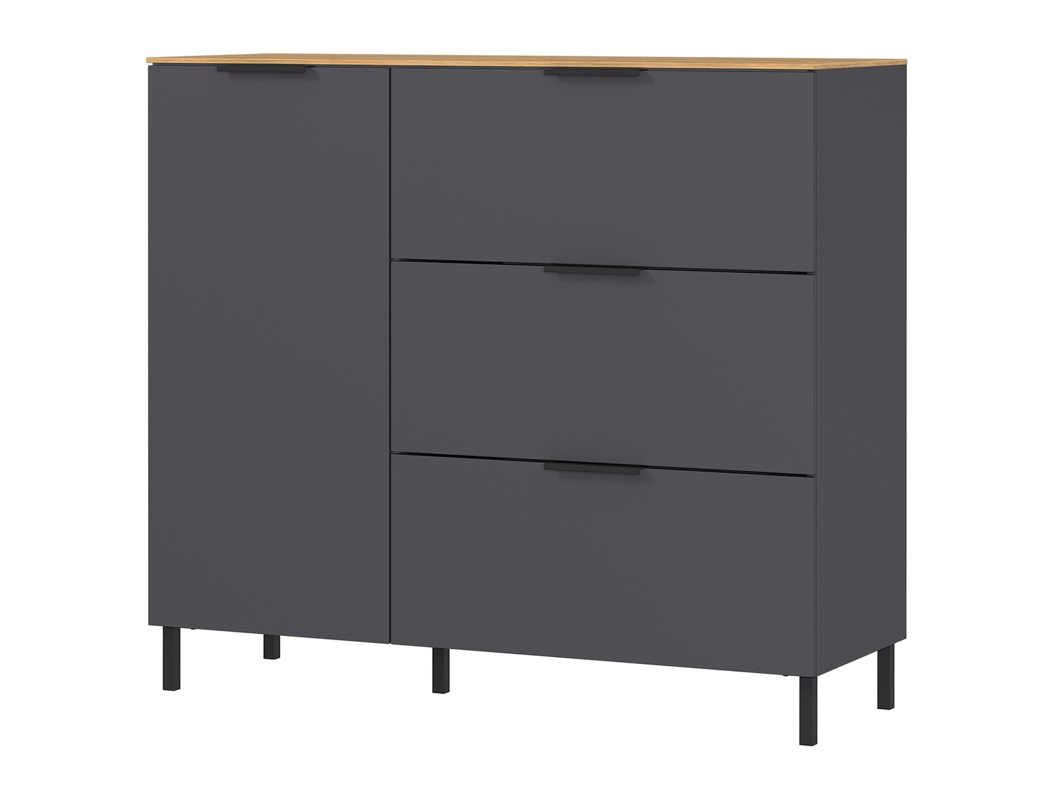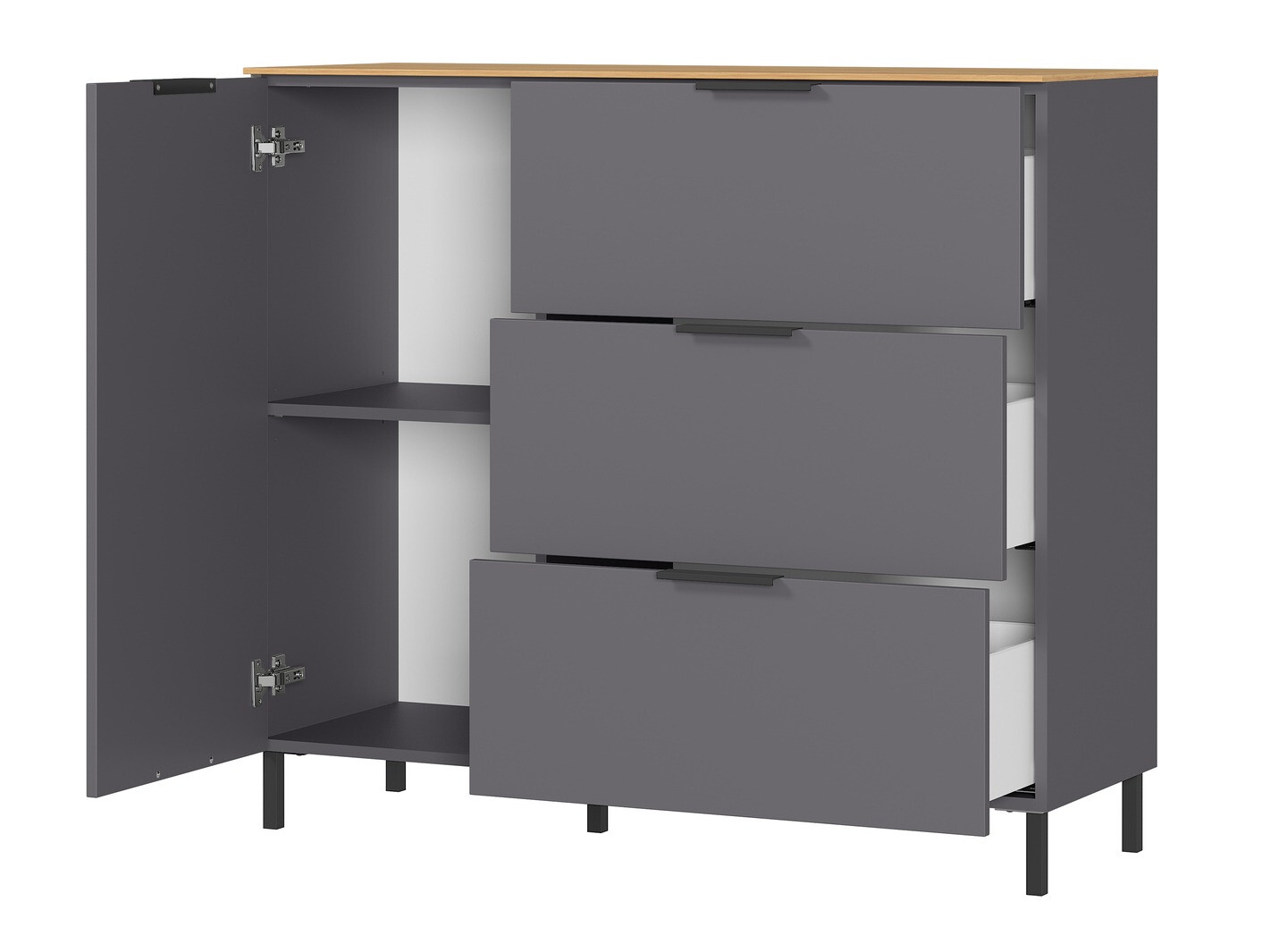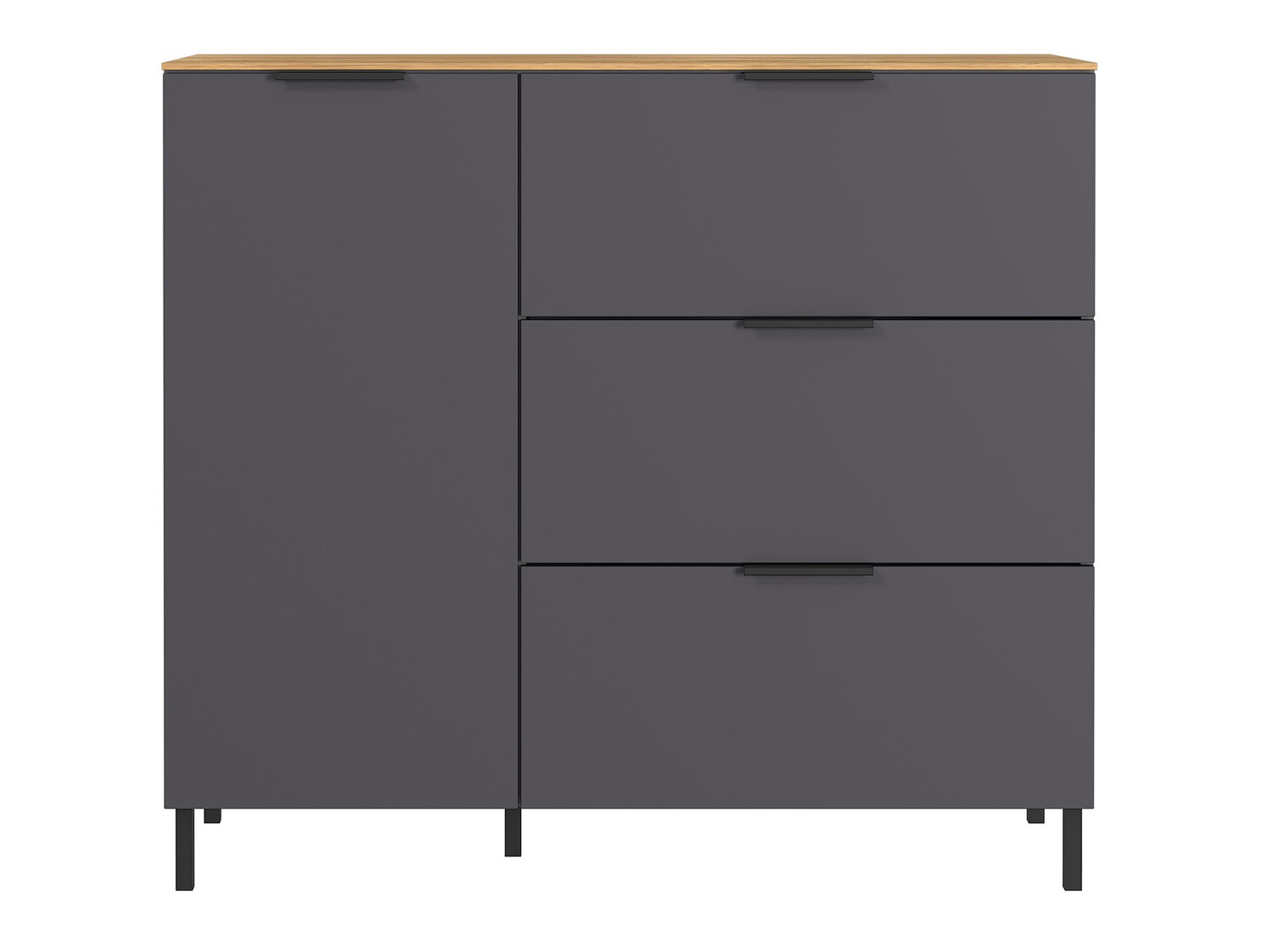 Ez a nappalibútor-kollekció a minimalista dizájn minden rajongójának örömet okoz. Ebben a kollekcióban több szín közül választhat. A kollekció bútorai lehetnek sötétebbek és világosabb színválasztékkal is rendelkezhetnek.A termékhez kétféle láb jár. Az alsó lábak tökéletesek a minimalista dizájn kedvelőinek, a fenti fémlábak pedig kiemelik a bútorok dizájnját. A matt bútorfelületek megőrzik a skandináv stílusra jellemző egyszerűséget. A bútorok műanyag borítású élei ellenállnak a mindennapi használat okozta sérüléseknek. Ezt a kollekciót fekete fém fogantyúk egészítik ki, amelyek tökéletesen beleolvadnak a bútortervezésbe, és szinte észrevehetetlenné válnak. A fiókok és ajtók csendes záródású mechanizmussal rendelkeznek, aminek különlegessége, hogy megvédi őket a gyors becsukódástól. A kollekció minden bútora színtelen anyaggal van bevonva, amely megvédi a bútort az apróbb karcolásoktól. A funkcionalitás és a kényelem a német gyártmányú kollekció szerves jellemzői. Teremtsen harmonikus környezetet ezzel a bútorkollekcióval.