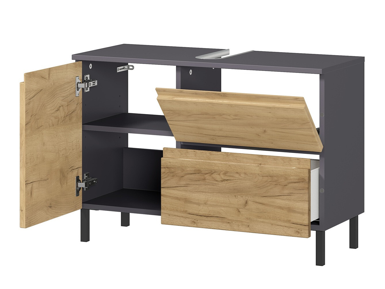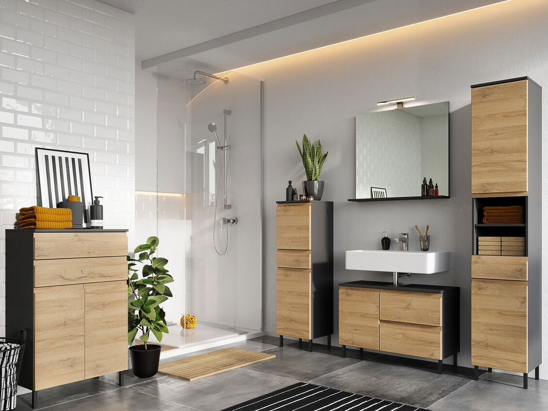 A fürdőszobabútor kollekció segítséget nyújt a modern fürdőszobabelső kialakításához. Ebben a bútorkollekcióban több szín közül választhat. A kollekció bútorai lehetnek sötétebb és világosabb színűek is. A kollekciót fém lábak egészítik ki, amelyek könnyedséget adnak a belső térnek. A kollekció összes bútora színtelen anyaggal van bevonva, amely megvédi a bútort az apró karcolásoktól. A bútorok műanyaggal bevont élei ellenállnak a mindennapi használat okozta mechanikai sérüléseknek. A fiókok és ajtók csendes záródású mechanizmussal rendelkeznek, aminek különlegessége, hogy megakadályozza a gyors záródást. A funkcionalitás és a kényelem a Németországban gyártott kollekció szerves részét képezik. A kollekcióban található bútorok állítható polcok funkcióval rendelkeznek, amelyek lehetővé teszik a tárgyak tárolásának legkényelmesebb módját. Hozzon létre egy modern fürdőszobát ezzel a bútorkollekcióval.