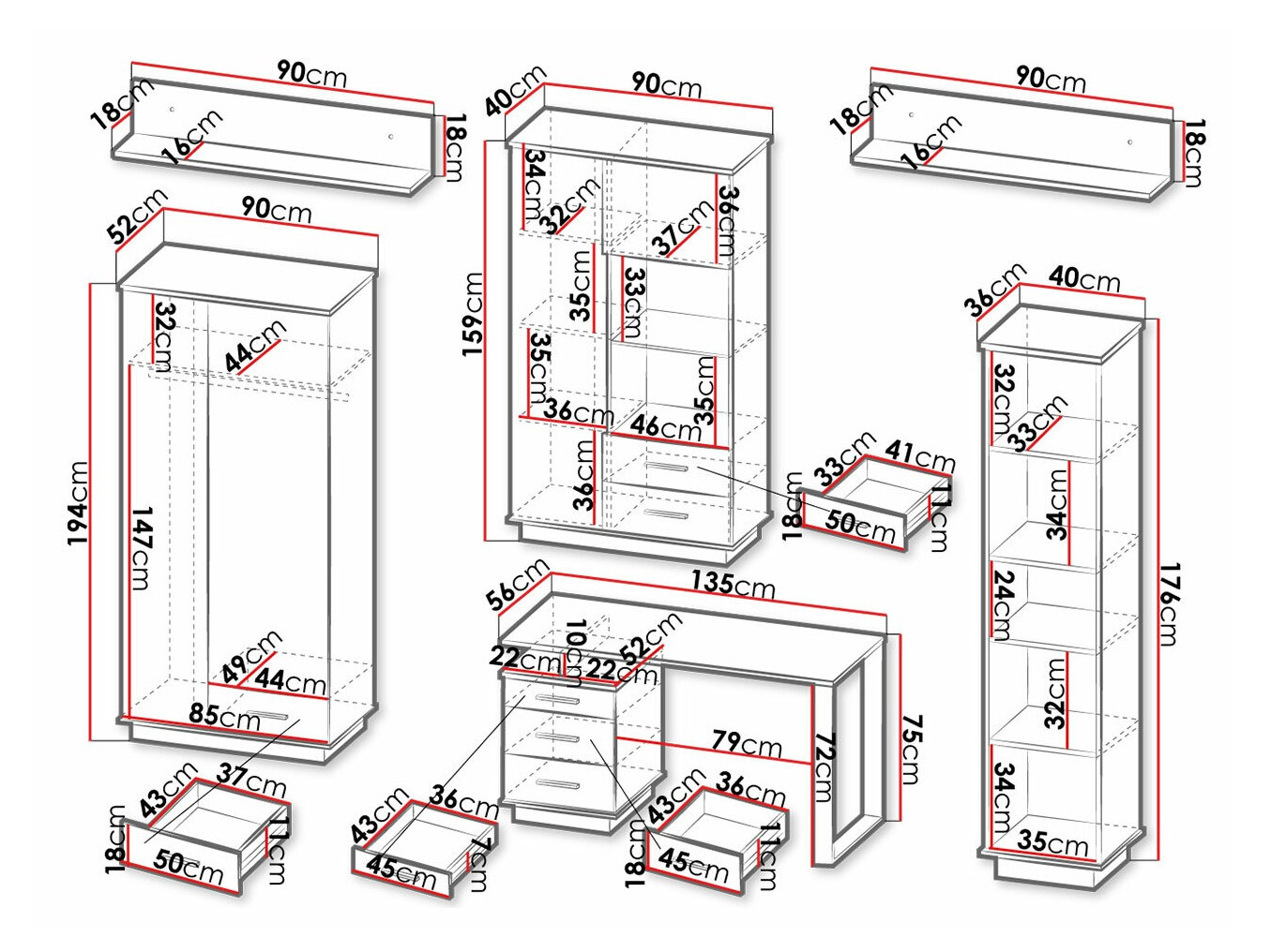 159 x 90 x 40; 176 x 40 x 36 cm