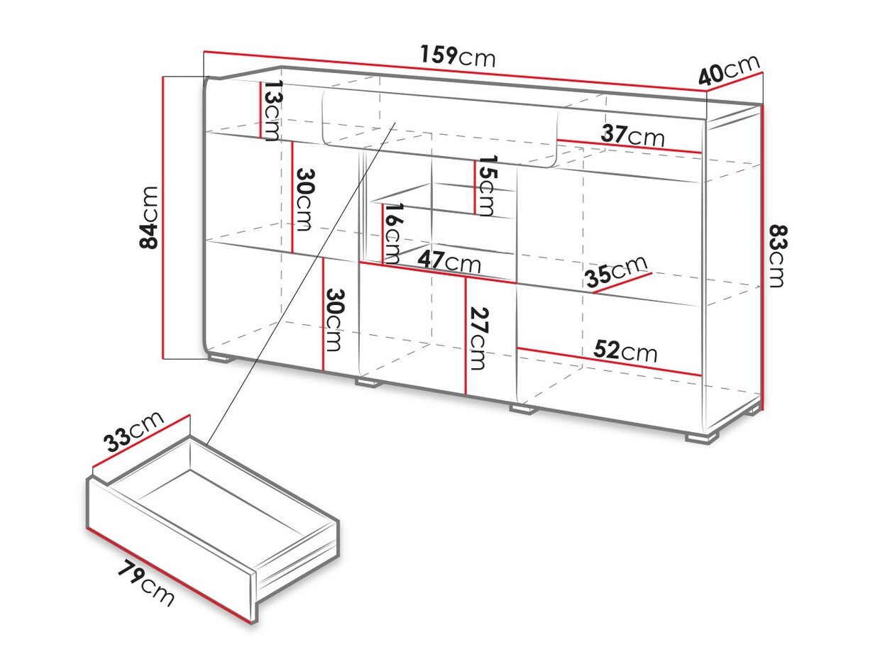A gyűjtemény különféle méretű szekrényeket, tágas fiókos szekrényeket, polcot és dohányzóasztalt tartalmaz. A bútor fényes felülete vizuálisan megnöveli a szobát. A komód ajtajai és fiókjai egyetlen kattintással nyithatók - ezt a kényelmet a beépített "Push to open" mechanizmus biztosítja.