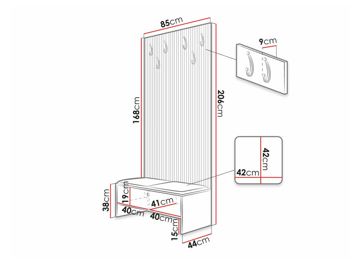 A szekrény alsó része normális. Lehetőség van az ülőrész párnáinak letakarására is, ha ilyen igény merül fel. A falrész egyáltalán nincs rögzítve az alsó részhez. Ez csak egy tábla a falra akasztani. Csalódás. A függőleges dekorációs táblák műanyag lécek. Csalódás. A fekete akasztók műanyagok és olcsónak tűnnek. Csalódás.